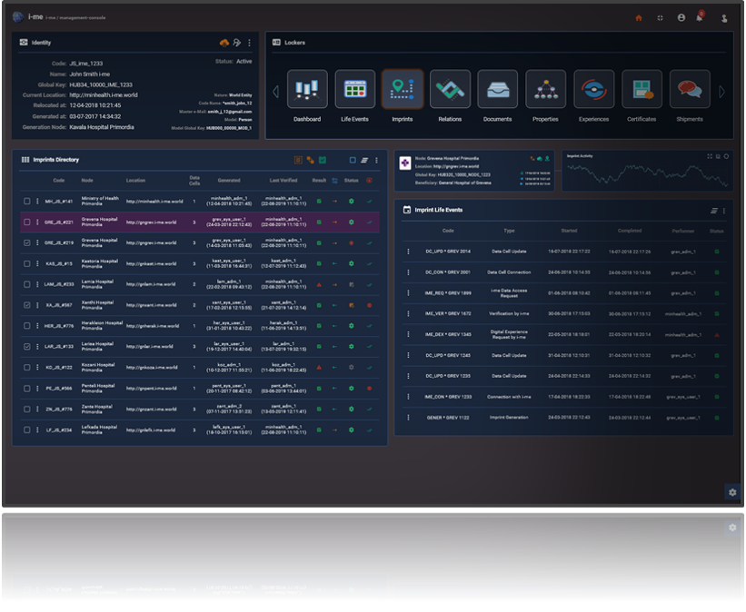 Digital experiences are all those micro worlds maintained in hundreds of databases for your own identity. With Primordia, they can all be connected and merged instantly, enabling you to visualize your distributed profiles and associated data as a single picture of how all others view and process yourself. This is what “me” stands for in “Ime”. By setting up imprints in all locations maintaining a profile of yours, you can use your Ime to connect this information, and harvest it constantly or on request. Primordia nodes will process your digital experience requests, fetch and document your micro world they maintain, and forward the package to your Ime host, for further processing. Specialized Primordia tools will enable you to view each package individually, by dynamically constructing the appropriate app or data network visualization, or in a combined way (eg your medical records from all visited hospitals, laboratories and doctor offices).