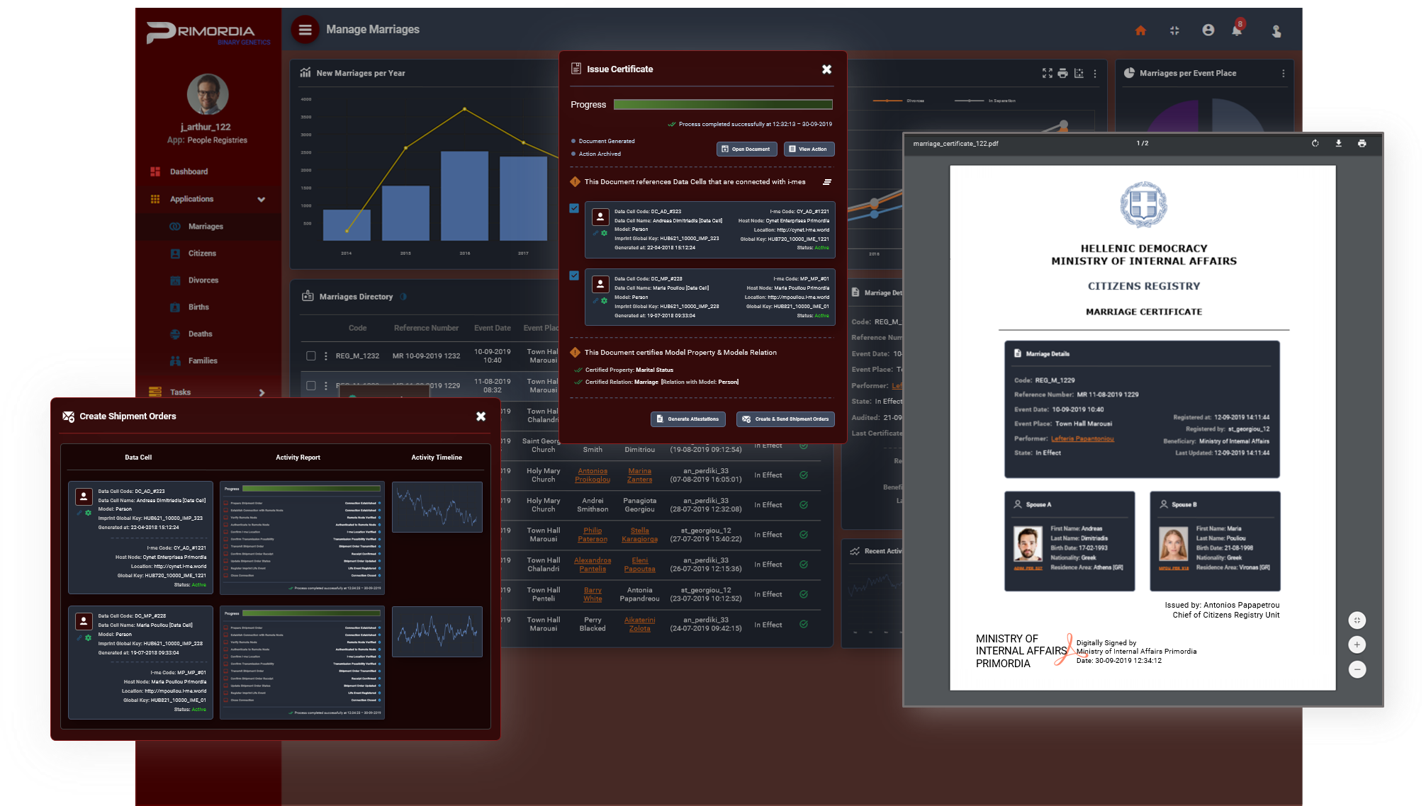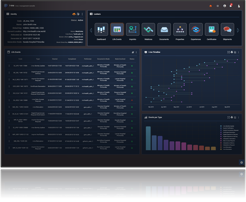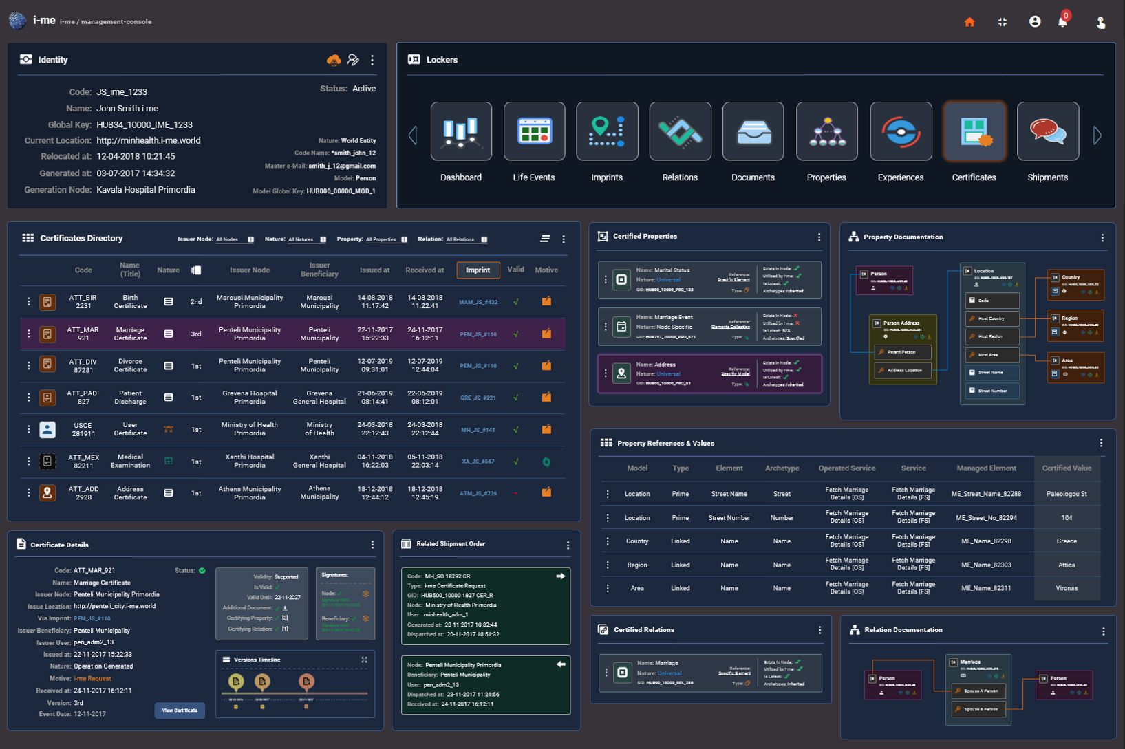 Use your ime imprint to retrieve and visualize your medical records from a Primordia enabled Medical Center. Connect to all hospitals you have visited as a patient, to get collective information about your medical history. Get a digitally signed Marriage Certificate from a Primordia enabled Municipality Archive, generated by Primordia apps, to certify your name or the relation with your spouse’s ime. Present your certified properties to Primordia nodes to authenticate and access restricted information. Use your vehicle’s ime, managed by your own, to collect service and repair records from garages or contracts from insurance companies. Sell your car, and just transfer its ime custody to the buyer, along with all its archives and links. Allow access to your ime data & document repository to Primordia nodes so as to upgrade their records with up-to-date information. These are just a few privileges you can have through your ime representation.