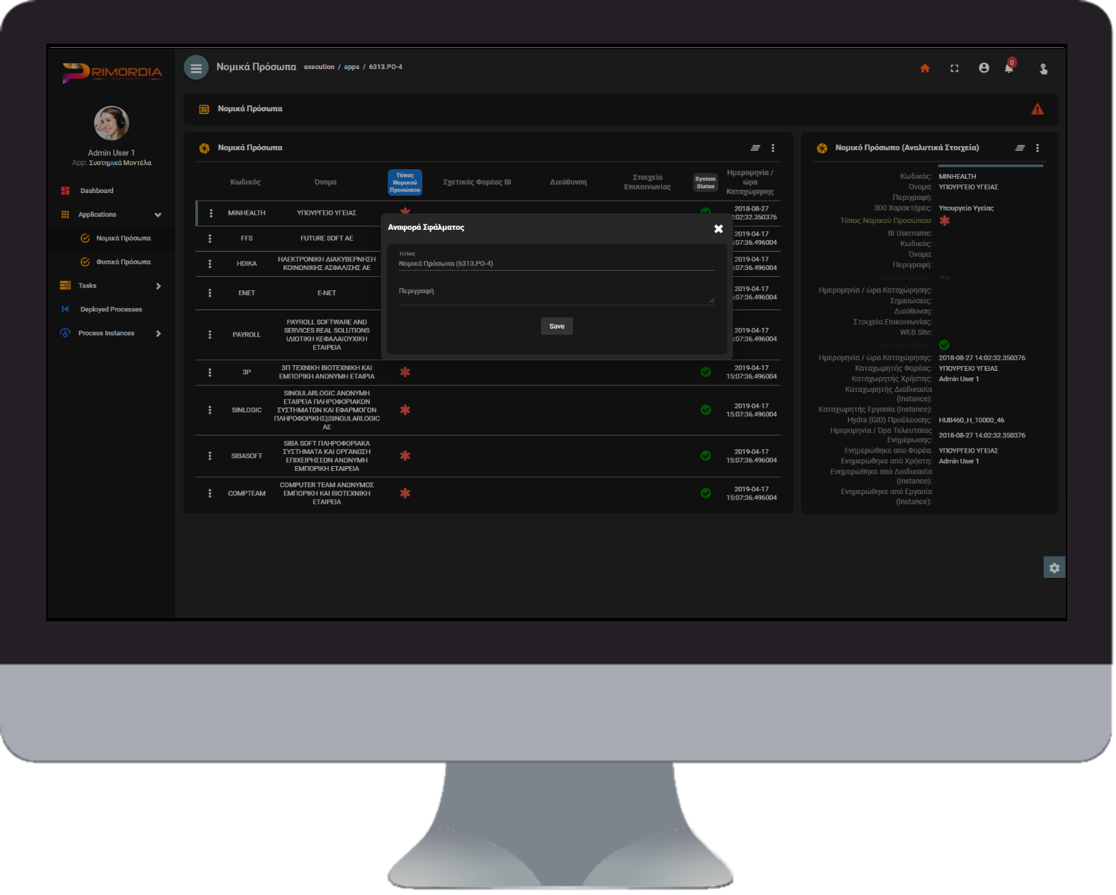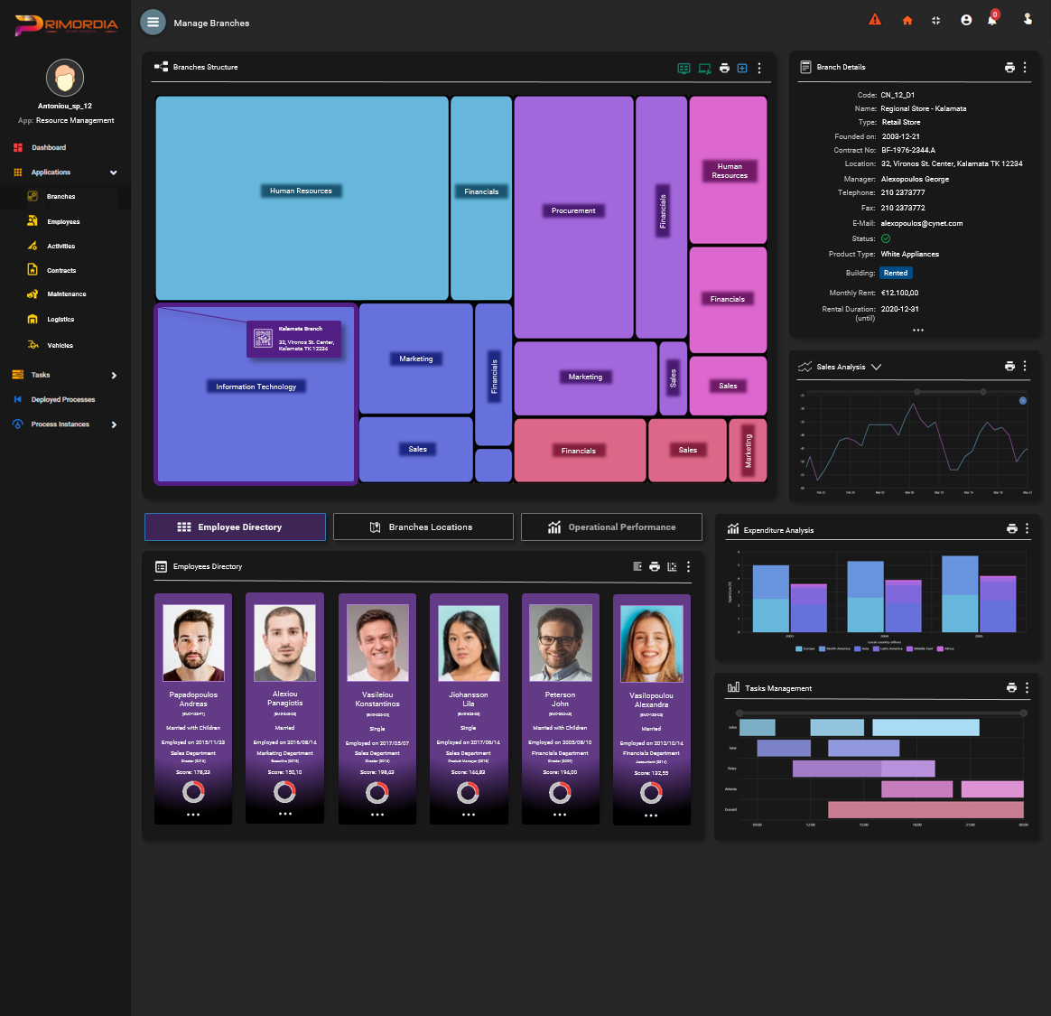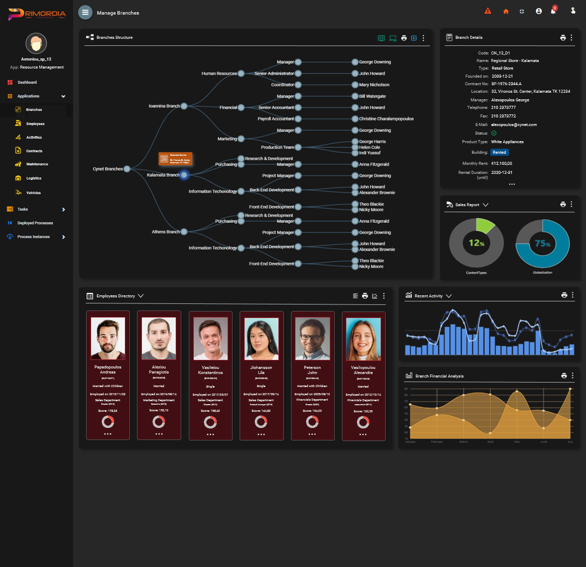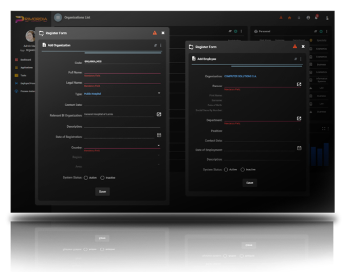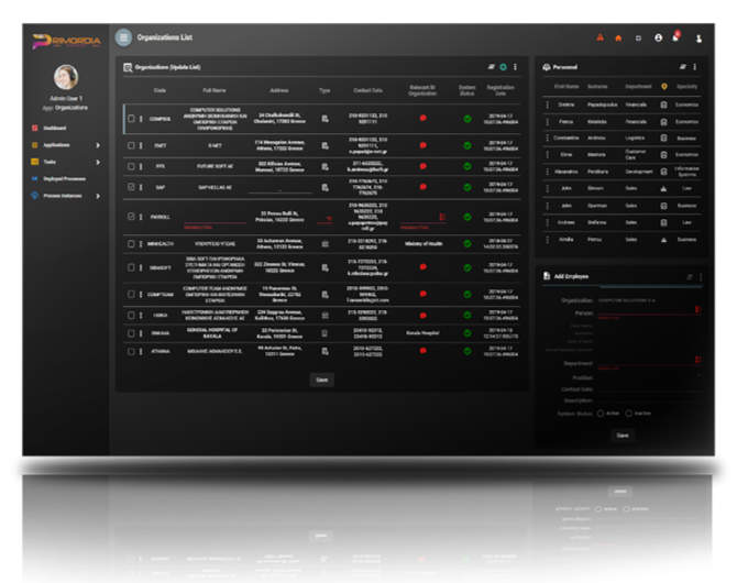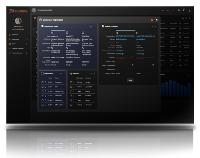 Primordia comes with pre built models for persons and legal bodies, along with an HRM app for structuring and managing organizational structures and employment relations. You can import other standard models for devices and systems as they get published from primordia servers or create your own employing entity definition from our directories. The same applies to apps or any other Primordia specification asset.