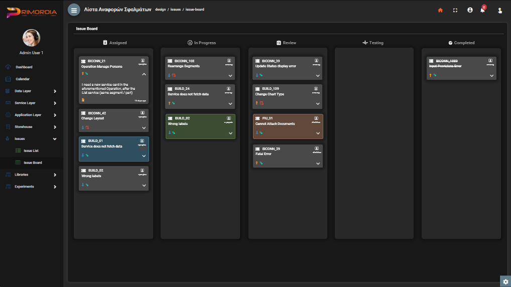 Developing apps with Primordia is a process actively engaging the end user community. End users can review app deployments in test or acceptance environment, and directly submit their comments for apps optimization. Specification managers monitor users’ feedback, register and assign issues to the involved designer communities, while controlling the overall redesign process and measuring performance and user acceptance. As a designer you can have instant access to your assignments and notifications, in order to effectively manage work to be done. Use drag and drop functionality to move your assignments across development phases, and invite other designers to work together in complex issues.