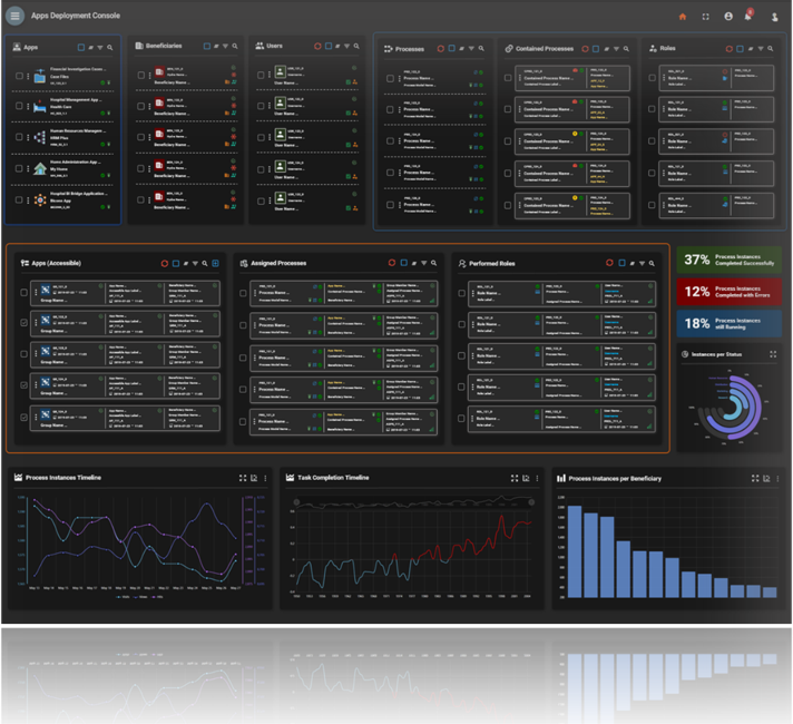Primordia incorporates an advanced Apps Deployment Dashboard through which this complexity is totally simplified. As soon as they are published for testing, user acceptance or production, app releases are deployed to beneficiary groups, but their processes (micro-apps and workflows) get assigned to individual beneficiaries. Thus, within the same app release, one beneficiary may have access to the same or different processes compared to other members of the respective group. In order for assigned processes to be accessible by end-users, the involved roles per category (performer, participant, supervisor) must be appointed to them. This way, one user may have different privilege on the same process compared to other users of the same beneficiary. Those assignments can be easily granted, activated, reconfigured, terminated, suspended or reactivated when necessary, in individual or group level, with just one click.