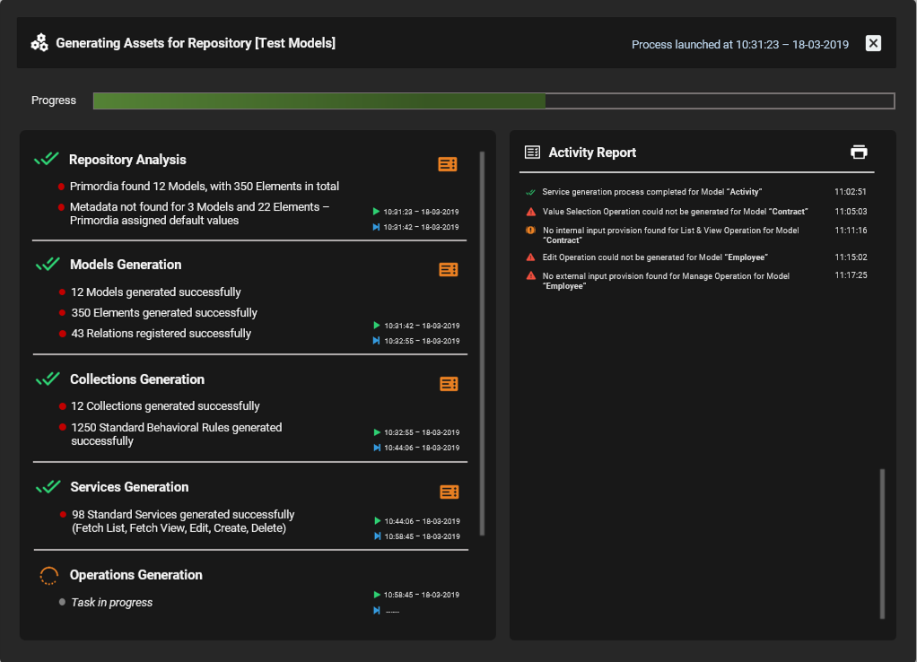 You can use automated intelligent tools to generate standardized specification assets in all layers and deliver a complete app with full navigation, by just using descriptive meta-data in your database schema. Just prepare your tables and fields, define descriptions, indicate parent and relative foreign keys, and you are almost done; just one more click, and Primordia will parse meta data and generate in a few minutes the required models, collections, standard behavior rules, CRUD services, full set of operations for managing your data, micro-apps for your menu and finally one complete, sound and fully operational app, accessible from any channel. You just need to put data to unfold its potential or to assign it to end users to rapidly get a first functional idea of what they will finally get and provide their feedback for re-engineering.
