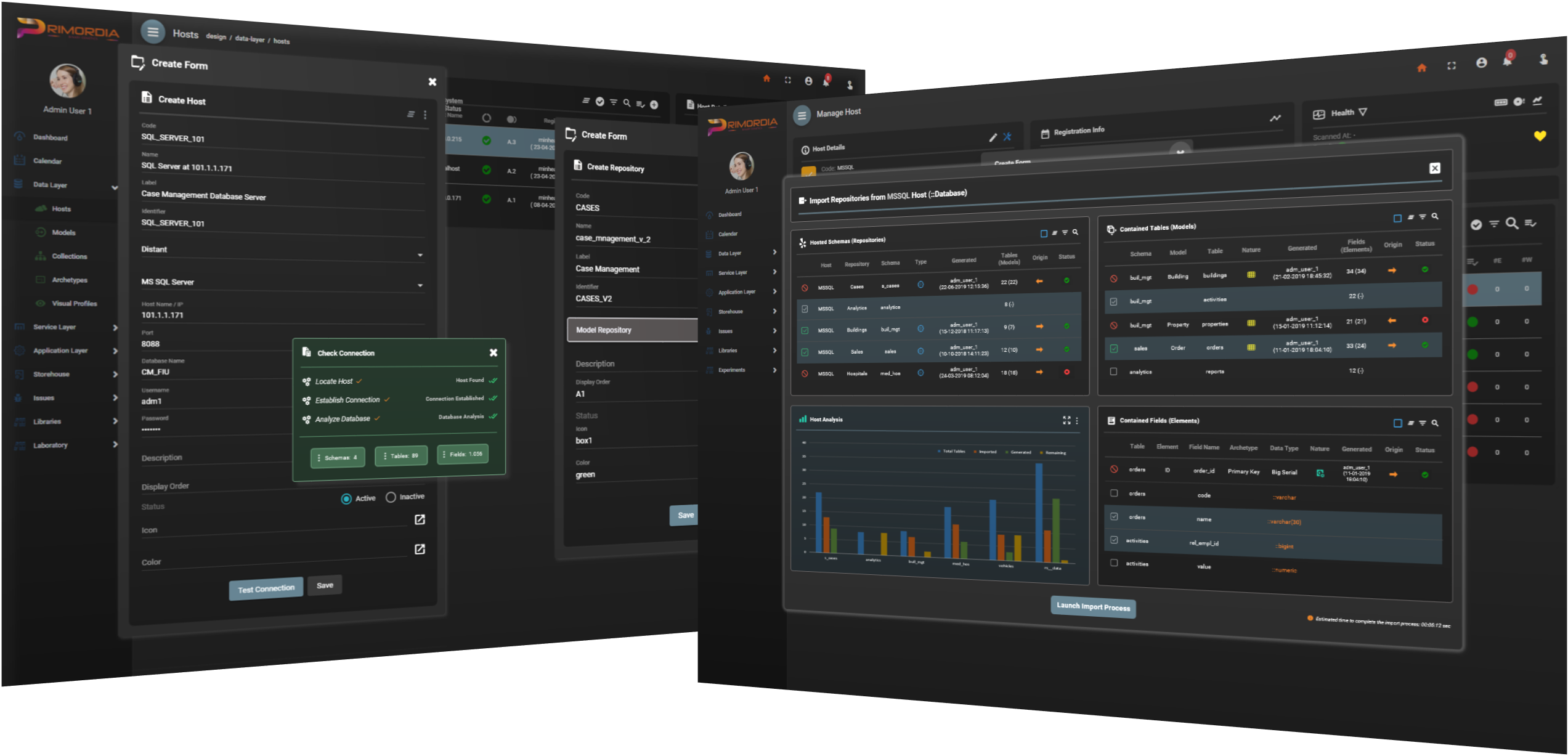 Using Primordia, IT managers can visually extend or modify existing data repositories, design new or deactivate relations among entities, or even semantically associate distributed data formations using existing identifiers or new global keys. Moreover, they can rapidly design and deploy unlimited apps, in order to validate specifications and document efficiency of the upgraded architecture. Information silos can be connected, data can be reused and shared among apps.