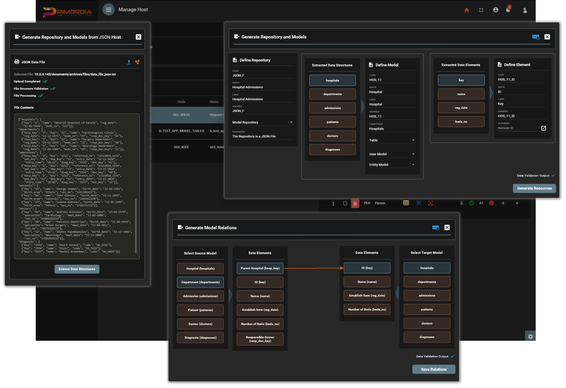 Primordia can access data hosts of any nature, relational or no-sql databases, file systems or even web services, within the local or wider private network, in other Primordia nodes, or the internet. As soon as a connection is established, the platform extracts and processes blueprints or sample data sets, so as to interpret structures, identifiers, formats and relations. Model specifications are generated on the fly, for all or a selected part of data repositories, in the form of recommendations to be further adjusted, calibrated and optimized by designers. Primordia will store valid specifications in its Models Warehouse, in order to be exploited by designers of higher specifications layers. Those models will enable Primordia apps to manage foreign data, in the same way that they manage data of local repositories.