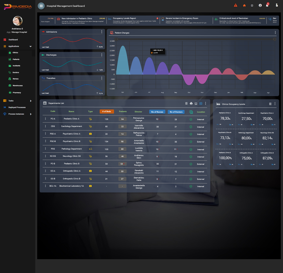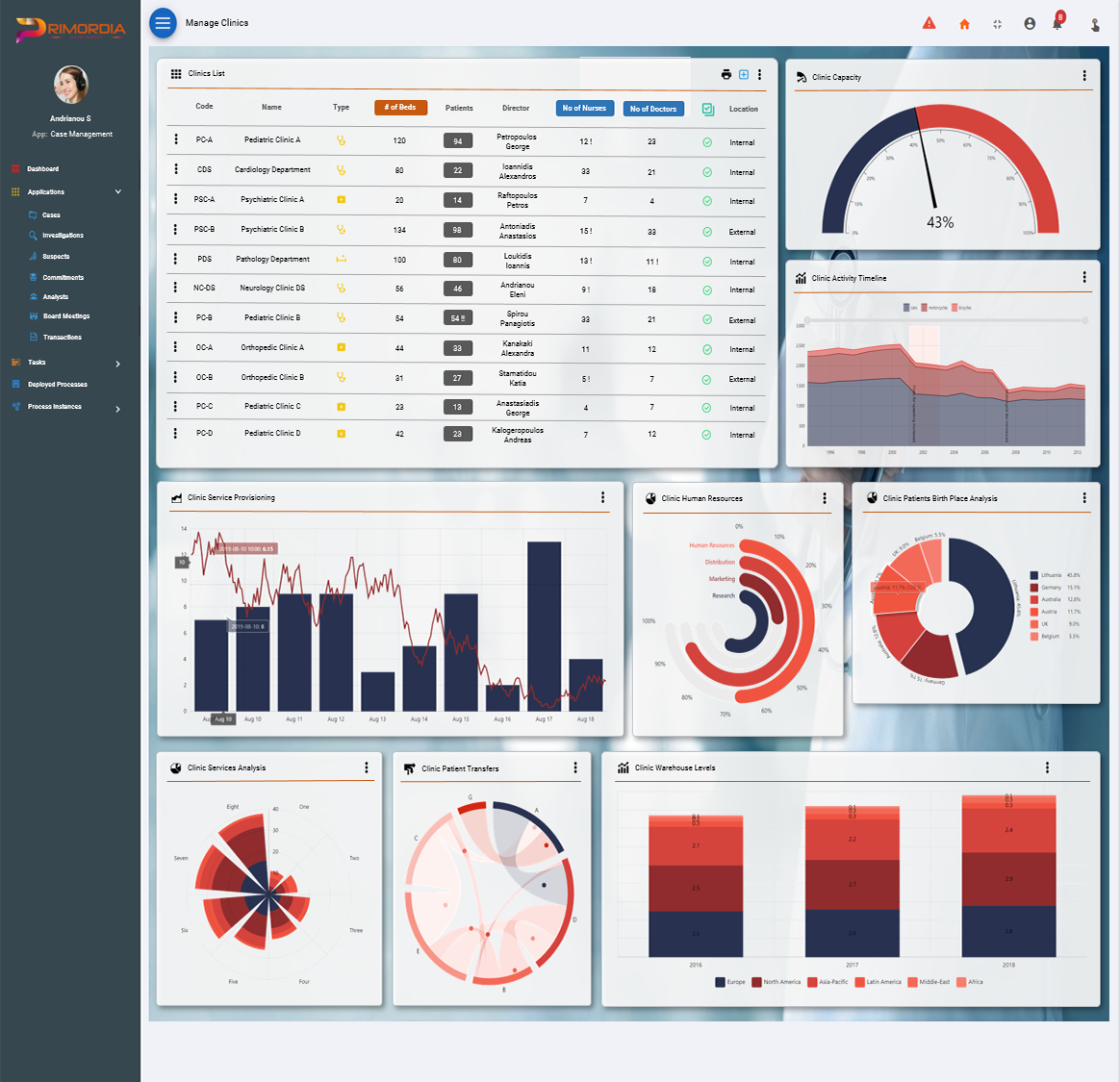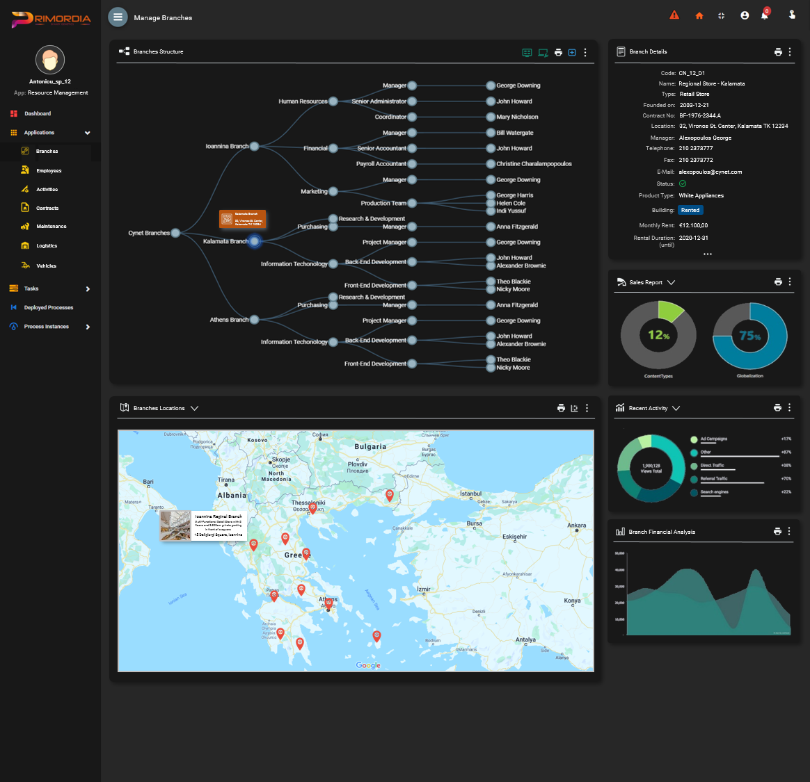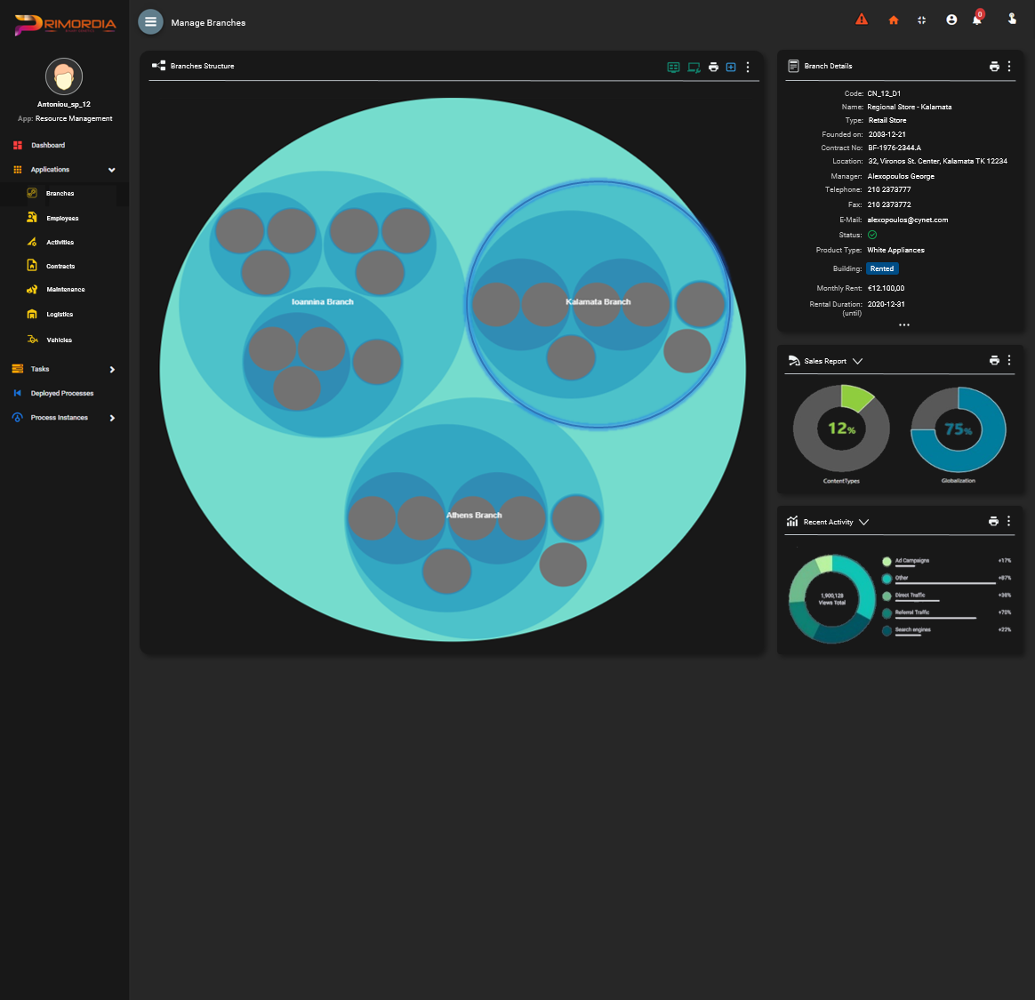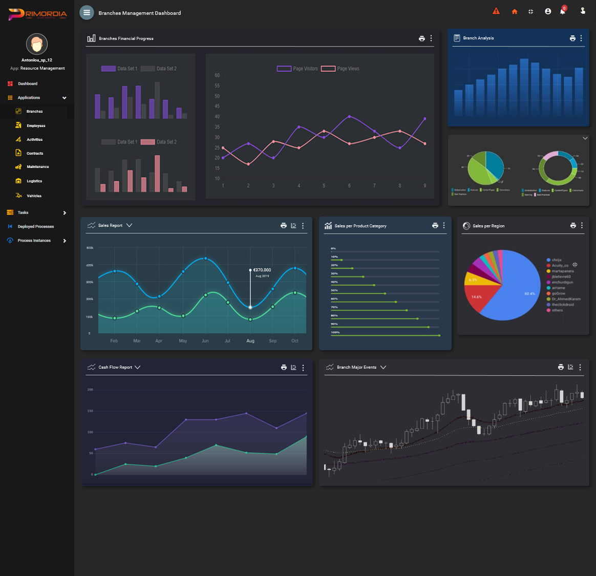You can design beautiful dashboards to demonstrate information wealth, with diverse visual reconfigurable components, passing through parameters to each other in real time. You can use lists or grids to visually arrange entity sets of a single model or extended entity sets from a collection. You can choose tree components to visualize data hierarchy within a model, or among different models related to each other. Composite cards enable you to segment and visually organize data of a record set or cross model record-sets, using drag and drop visual editors. Data networks can be visually developed using map operations orchestrating node and link fetcher services. Aggregated information can be easily generated and visualized using alternative interactive charts of multiple dimensions. You can use spatial data attributes to arrange information upon geographical maps. Those are just a few options you have, and even more are about to come in the near future.
